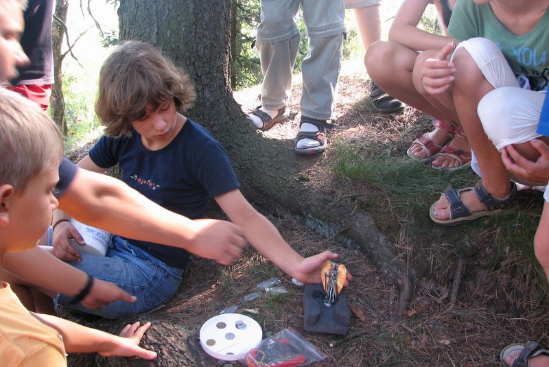 Poslední cesta za pokladem byla zvlášť napínavá, protože byla na pokračování. Začínali jsme na hřbitově u kostela v Jitravě v Podještědí, kde jsme na jednom náhrobku měli vyčíst potřebné údaje. Po vložení do GPS nám šipka ukázala další směr putování, a tak jsme cesta necesta zdolávali Jitravský vrch a prošli několika určenými stanovišti. Na jednom jsme se dokonce měli všichni vyfotografovat. Poslední souřadnice nás teprve dovedly k cíli. Pak už zbývalo jen se pořádně porozhlédnout.